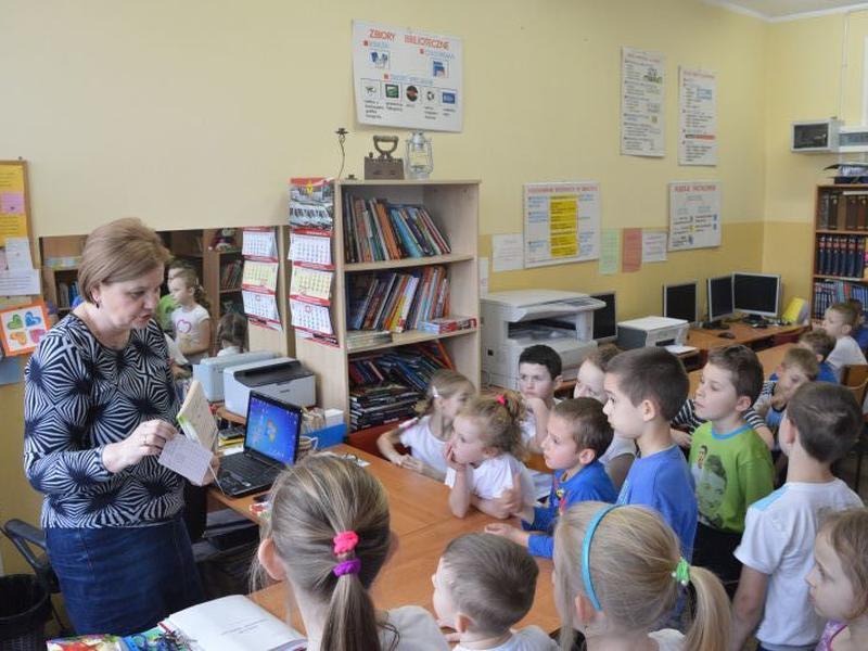 Pierwszaki w bibliotece szkolnej.
