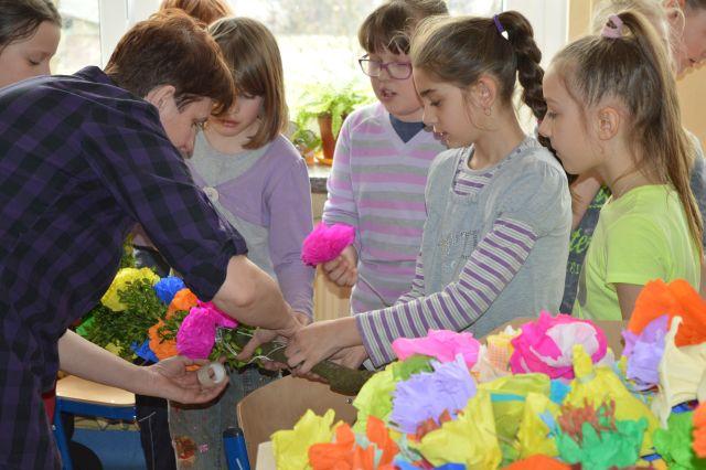 Uczniowie kl. 3 wykonują palmy.