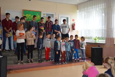 W dniu 20 maja 2015r. uczniowie kl.1 SP zostali pasowani na czytelników biblioteki szkolnej. Dzieci dowiedziały się, jak należy dbać o książki i jak się zachowywać w bibliotece. Zapoznały się ze zbiorami biblioteki i zasadami korzystania z nich. Najważniejszym momentem całej uroczystości było złożenie przez uczniów przyrzeczenia, po którym mogli przystąpić do wypożyczenia swojej pierwszej książeczki. Uroczystość pasowania na czytelnika poprowadzili przedstawiciele klasy III Publicznego Gimnazjum oraz opiekun biblioteki. Na pamiątkę tego wydarzenia dzieci otrzymały dyplomy pasowania na czytelnika