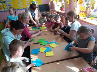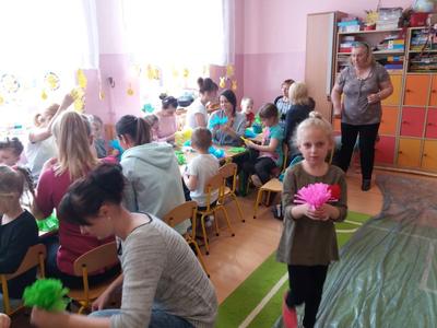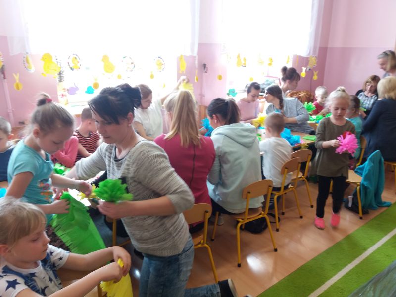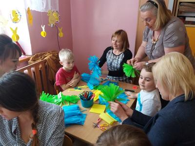 W naszej grupie „Wielkanoc tuż, tuż”. Głównym celem zajęć było przybliżenie dzieciom tradycji Świąt Wielkanocnych dotyczących Niedzieli Palmowej oraz wzmocnienie więzi emocjonalnej z rodzicami. Dzieci wraz z rodzicami wykonały piękną i kolorową palmę wielkanocną.