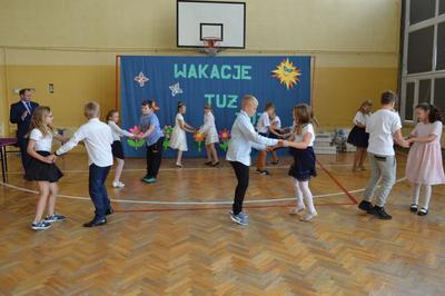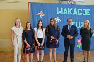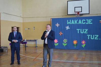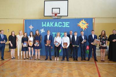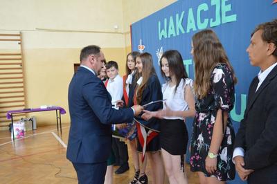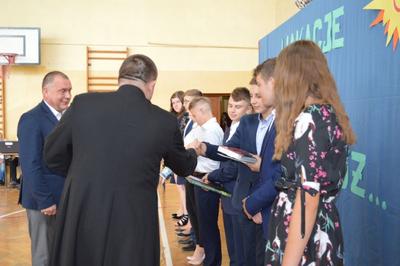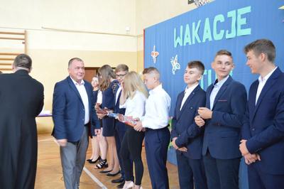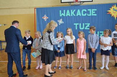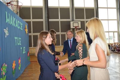 Pan Norbert Celebański wraz z zaproszonymi gośćmi, przewodniczącą Rady Rodziców oraz wychowawcami klas wręczyli najlepszym uczniom świadectwa z wyróżnieniem oraz nagrody książkowe. Oklaskom nie było końca.