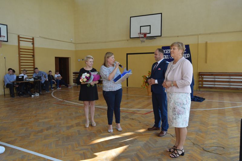 Zastępca Burmistrza, pan Sławomir Owczarek wraz z zaproszonymi gośćmi złożył kwiaty oraz podziękowania za 10-letnią współpracę ustępującej pani Dyrektor Annie Wyrwał oraz życzył sukcesów Panu Dyrektorowi Norbertowi Celebańskiemu, który od 01.09.2018r. objął funkcję dyrektora Zespołu Placówek Oświatowych w Kurzelowie