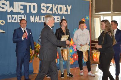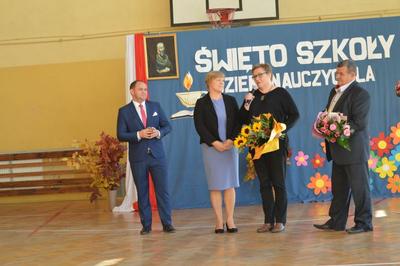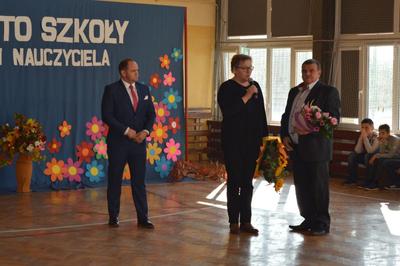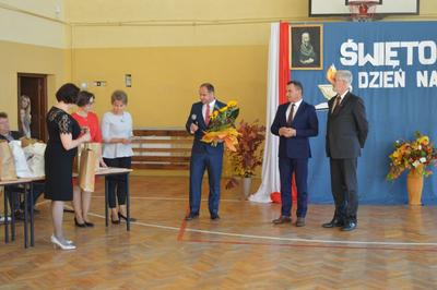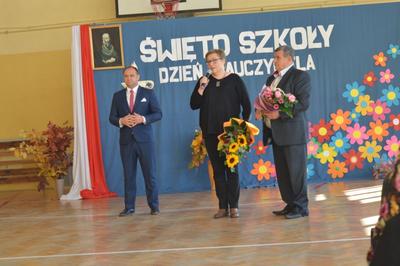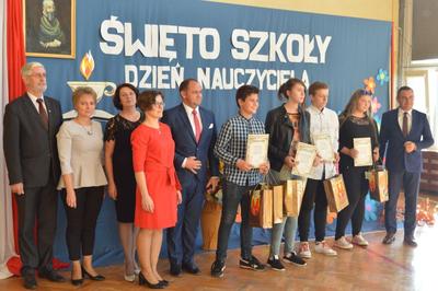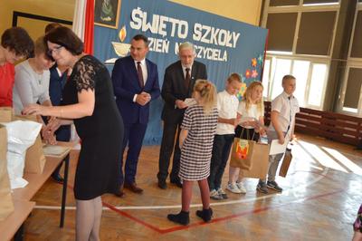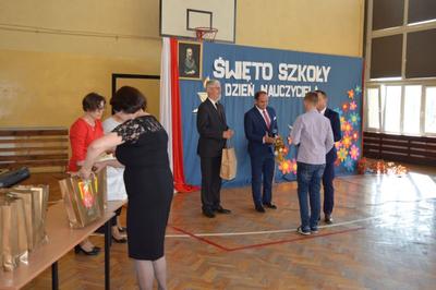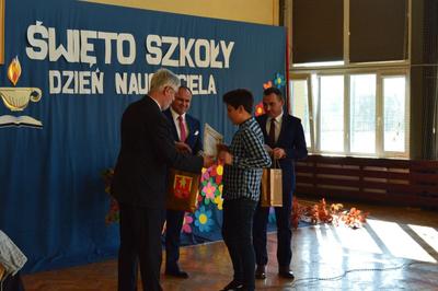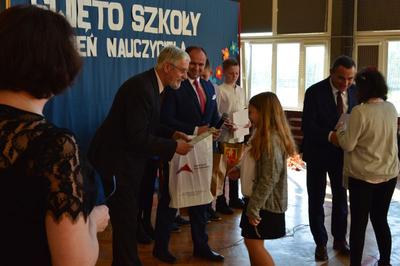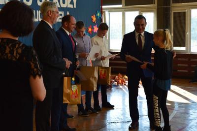 Następnie w obecności przybyłych gości: burmistrza gminy Włoszczowa Pana Grzegorza Dziubka, wizytatora Kuratorium Oświaty w Kielcach Pana Sławomira Krzysztofika, ks. Proboszcza Jacka Bonio, emerytowanych nauczycieli i pracowników szkoły podziwialiśmy występy artystyczne uczniów. Szczególnym momentem było podsumowanie konkursu wiedzy o Janie Brożku- patronie naszej szkoły. Jego laureaci otrzymali wartościowe nagrody.