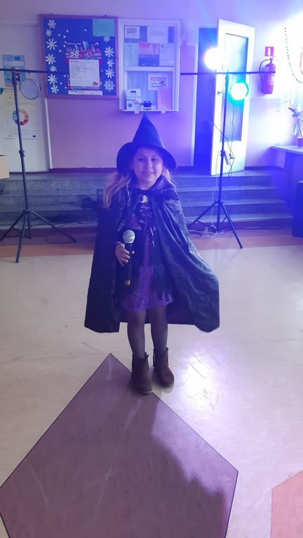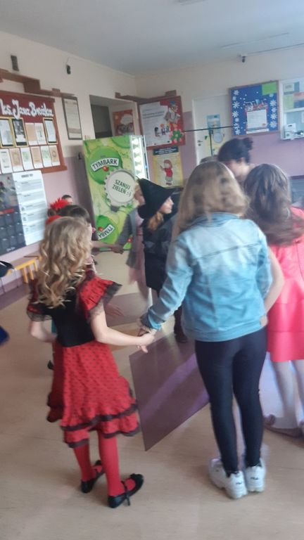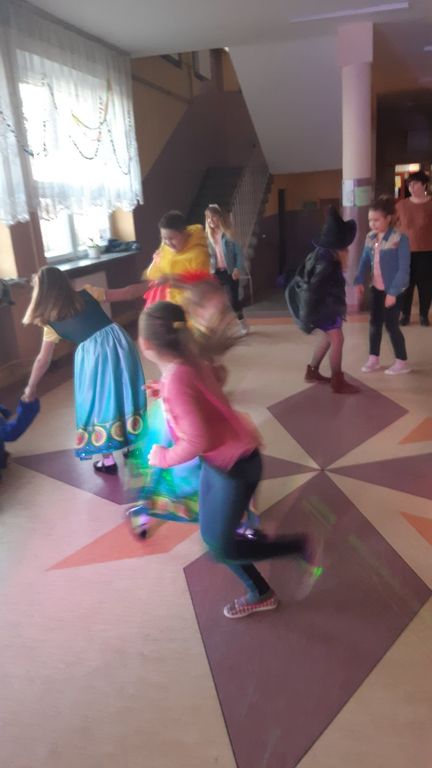 Jak nakazuje tradycja, bajkowo przebrane dzieci, wystąpiły w ciekawych, kolorowych kostiumach. Pojawił się kapitan statku marynarki wojennej, Żółw Ninja, Batman . Niektórzy byli nie do poznania, inni budzili podziw, a niekiedy nawet mały dreszczyk. Wyjątkowe było pojawienie się czarownicy, bo zaklęć rzucać nie chciała, czarować też nie , a o rzucaniu uroków to chyba nawet nie słyszała. Za to jak szalona tańczyła makarenę porywając do tańca nawet dyrektora szkoły pana Norberta Celebańskiego i wszystkie zgromadzone dzieci oraz opiekunki.