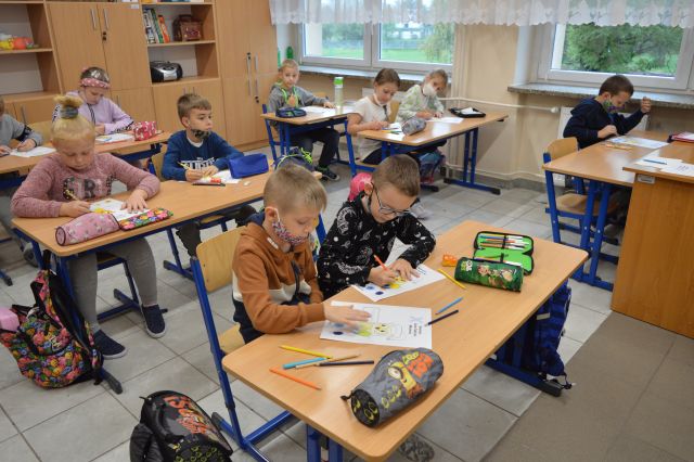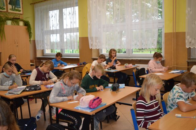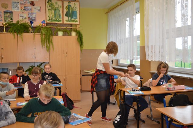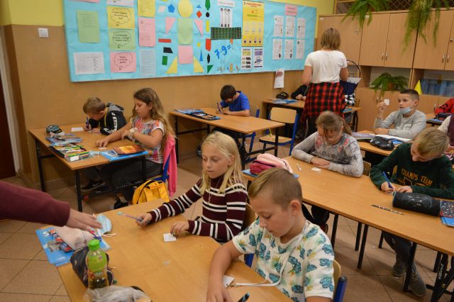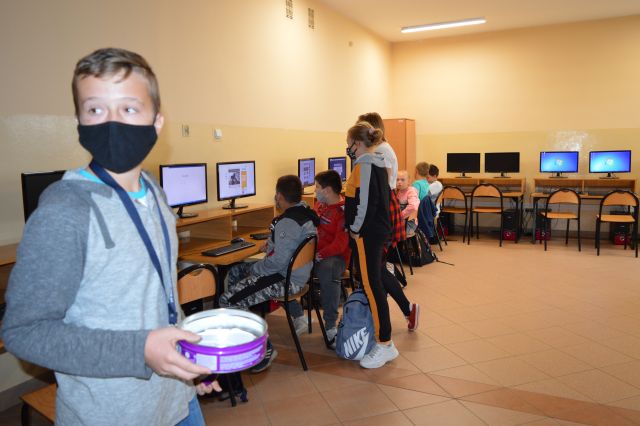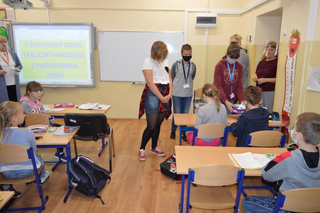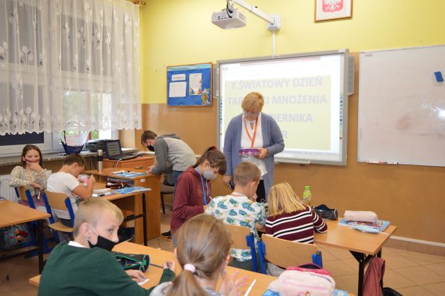 W czasie przerw międzylekcyjnych również można było sprawdzić umiejętność tabliczki mnożenia w specjalnie przygotowanym miejscu na korytarzu szkolnym z zachowaniem zasad bezpieczeństwa.