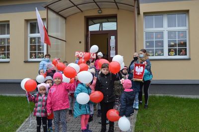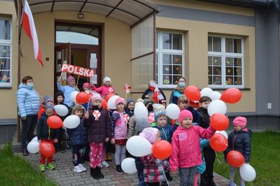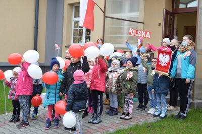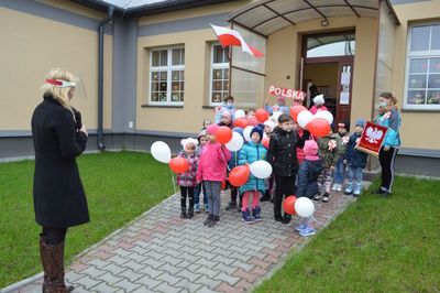 Pani Wicedyrektor Anna Batorska wydała Komendę do odśpiewania hymnu. Przedszkolaki z grup Krasnoludki oraz Biedroneczki pod opieką pani Bożeny Będkowskie oraz Iwony Soleckiej odśpiewały hymn. Podczas śpiewania hymnu dzieciaki godnie prezentowały barwy narodowe, które zaprezentowały w postaci biało-czerwonej flagi, kotylionów oraz balonów. Celem akcji było zachęcenie dzieci do wspólnego przeżywania Narodowego Święta Niepodległości.