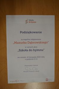 W dniu 10.11.2020r. o godz. 11.11 Przedszkole Samorządowe w Zespole Placówek Oświatowych w Kurzelowie wzięło udział w odśpiewaniu hymnu „Mazurka Dąbrowskiego” w ramach akcji „Szkoła do hymnu”.