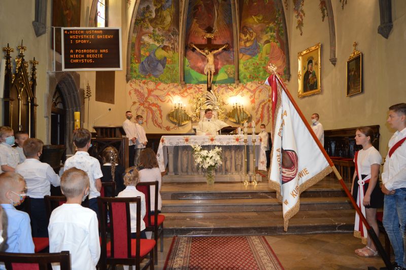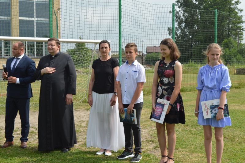 25 czerwca 2021r. zakończyliśmy kolejny rok szkolny. Tradycyjnie uroczystości rozpoczęliśmy od mszy świętej, podczas której ksiądz Proboszcz, Jacek Bonio w wygłoszonej homilii odwołał się do ogromnego wysiłku wszystkich tworzących środowisko szkolne. Przy tej okazji poczet sztandarowy składający się z uczniów klasy ósmej przekazał sztandar do rąk nowego pocztu sztandarowego – uczniów klasy szóstej.