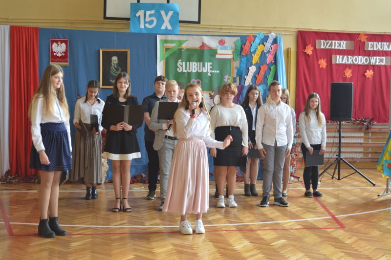 Dzień ten rozpoczął się Mszą Świętą o godz. 8.30 odprawioną przez Proboszcza ks. Jacka Bonio. Przed Mszą delegacja złożyła pod pomnikiem ks. Jana Brożka kwiaty i zapaliła znicze. Po powrocie do szkoły uczniowie zaprezentowali krótki program artystyczny dotyczący Dnia Edukacji Narodowej oraz postaci naszego Patrona. Był to moment, po którym nastąpiło wręczenie Nagród Dyrektora dla wyróżniających się w pracy nauczycieli w minionym roku szkolnym (wyróżnionych zostało 10 nauczycieli przedszkola i szkoły). Nadmienić należy, że w dniu 14.10.2021r. w Domu Kultury we Włoszczowie 7 nauczycieli naszej szkoły otrzymało wyróżnienia w postaci Nagród Burmistrza.