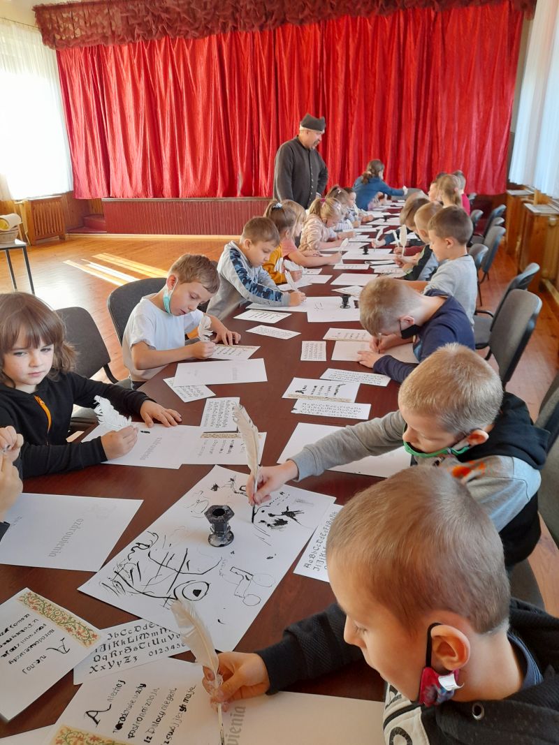 27. 10. 2021r. uczniowie klas I wraz z wychowawczyniami wzięły udział w warsztatach z „Eko-kreatywności 2021” w Domu Kultury w Kurzelowie. Dzieci zapoznały się z historią papieru i piśmiennictwa, pokazem czerpania papieru, pisaniem gęsim piórem i odciskaniem pieczęci lakowej. Był to idealny sposób na naukę poprzez twórczą zabawę. Dzieci kończyły warsztaty z własnoręcznie wykonanymi pamiątkami, których nie kupią w żadnym sklepie. Zajęcia były prowadzone w średniowiecznym nastroju, który rozbudzał wyobraźnię uczestników. Dodatkowo poruszana była kwestia troski o środowisko, mająca na celu kształtowanie proekologicznej postawy u najmłodszych.