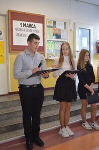 Pierwszego marca bieżącego roku uczniowie naszej szkoły krótkim apelem uczcili pamięć o Żołnierzach Wyklętych. Przedstawiciele klasy ósmej a: Karolina Olak, Paulina Skiba, Liliana Kremblewska oraz Jakub Piech przypomnieli bohaterską postawę podziemia niepodległościowego lat 40-tych i 50-tych XX wieku. Postawa ludzi niezłomnych to wzór patriotyzmu, z której każdy może brać przykład.