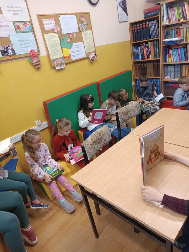 Dnia 11 marca 2024 r. klasa 1a w ramach zajęć innowacyjnych uczestniczyła w lekcji bibliotecznej. Podczas zajęć uczniowie przypomnieli sobie podstawowe wiadomości związane z biblioteką, jak należy dbać o książkę oraz dlaczego warto sięgać po lekturę. Jednak najważniejszą kwestią poruszaną podczas zajęć była reklama książki. Pierwszoklasiści wykorzystując zdobytą wiedzę próbowali wymyślić sposoby, jak namówić drugą osobę do czytania. Na koniec każdy uczeń wypożyczył wybraną przez siebie książkę, którą po przeczytaniu spróbuje zareklamować.