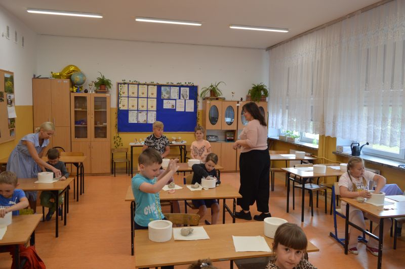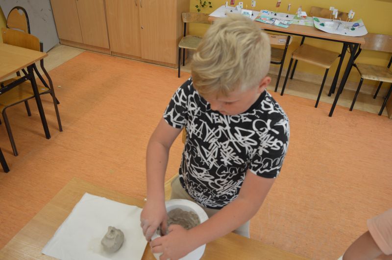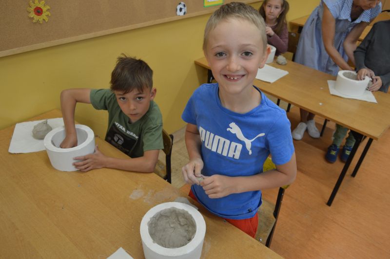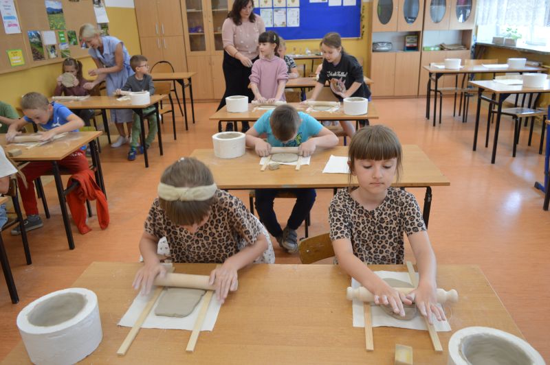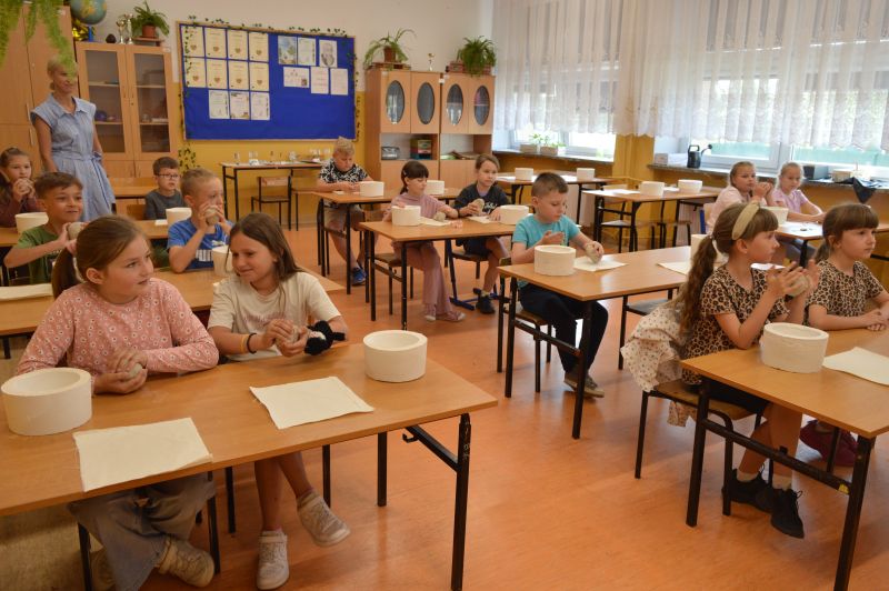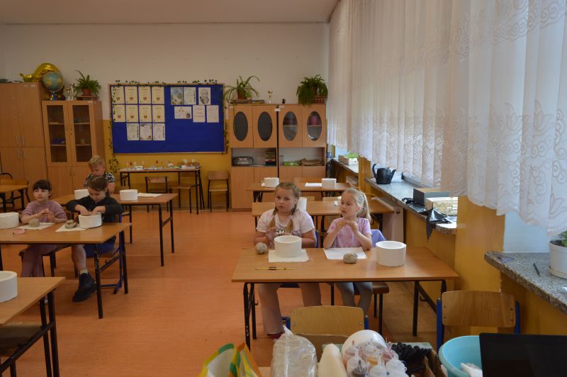 W dniu 06.05.2024r. w naszej szkole odbyły się warsztaty ceramiczne. Wzięli w nich udział uczniowie klas 1-3. Poprowadzone zostały przez absolwentkę naszej szkoły Karinę Ożarowską. Dzieci, które wzięły udział w warsztatach nie tylko dobrze bawiły się lepieniem gliny, ale również miały okazje stworzyć dla siebie naczynia, których mogą używać w domu (talerzyki i miseczki). Na koniec uczestnicy zajęć używając wyobraźni pięknie pomalowali swoje dzieła. Wszyscy byli zadowoleni i świetnie się bawili. Składamy serdeczne podziękowania Pani Karinie.