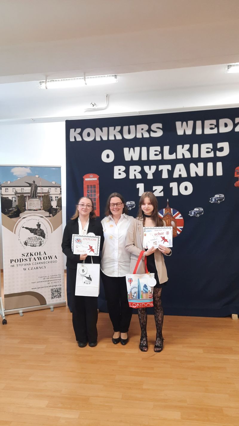28.05.2025 dwie uczennice z naszej szkoły z klasy VIII: Zuzanna Grzegorczyk i Maja Zaborowska, wzięły udział w konkursie z wiedzy o Wielkiej Brytanii. Konkurs zorganizowała Szkoła Podstawowa w Czarncy. Po bardzo szczegółowych pytaniach i ostrej dogrywce, Zuzanna zajęła III miejsce, a Maja VIII. Należało się wykazać wyjątkową wiedzą i talentem także w zakresie przeliczania jednostek miary i wagi. GRATULUJEMY i jesteśmy z Was dumni. Opiekunem uczennic i osobą, która je przygotowała do konkursu była Beata Janaczek.
