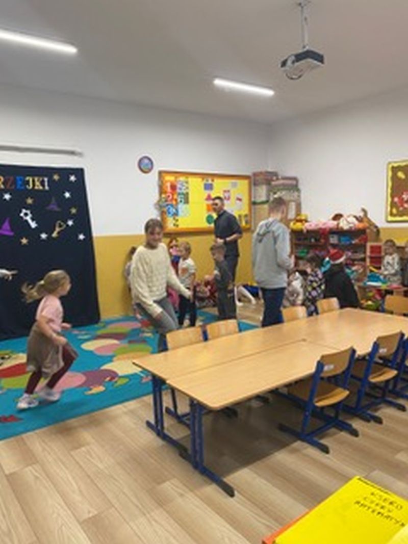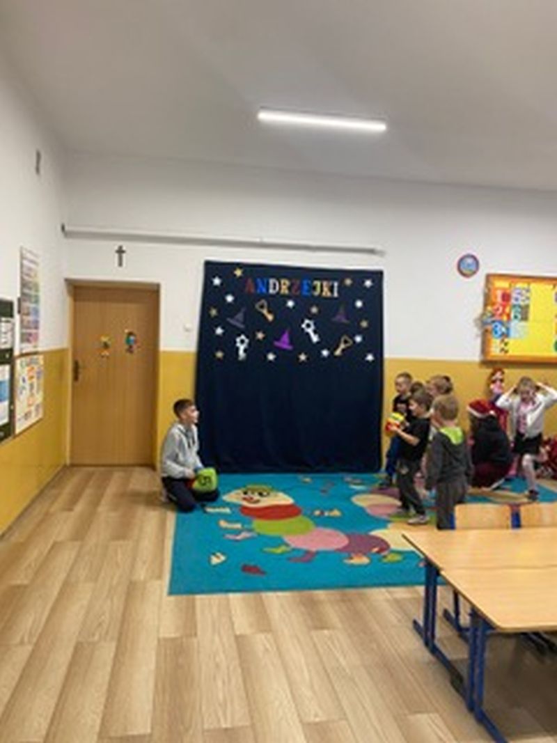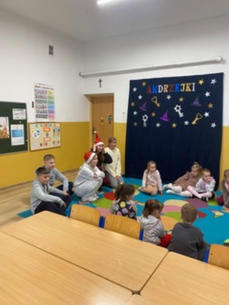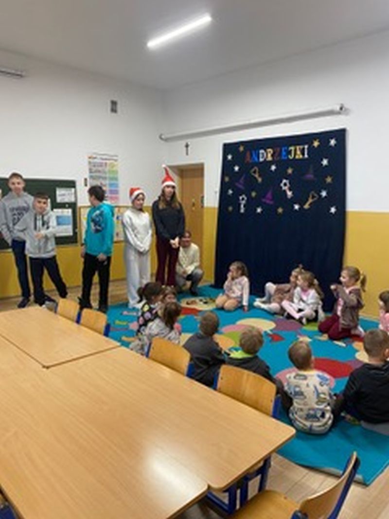 W piątek 28 listopada, na wspólnym spotkaniu, uczniowie klasy VII bawili się z młodszymi kolegami i koleżankami z przedszkola, w cudownej andrzejkowej atmosferze. Na koniec zabawy uczniowie częstowali maluszki oraz panie wychowawczynie, przygotowanymi przez siebie na zajęciach kreatywnych, świątecznymi pierniczkami. To były bardzo