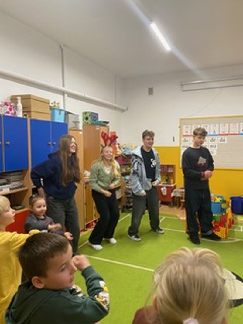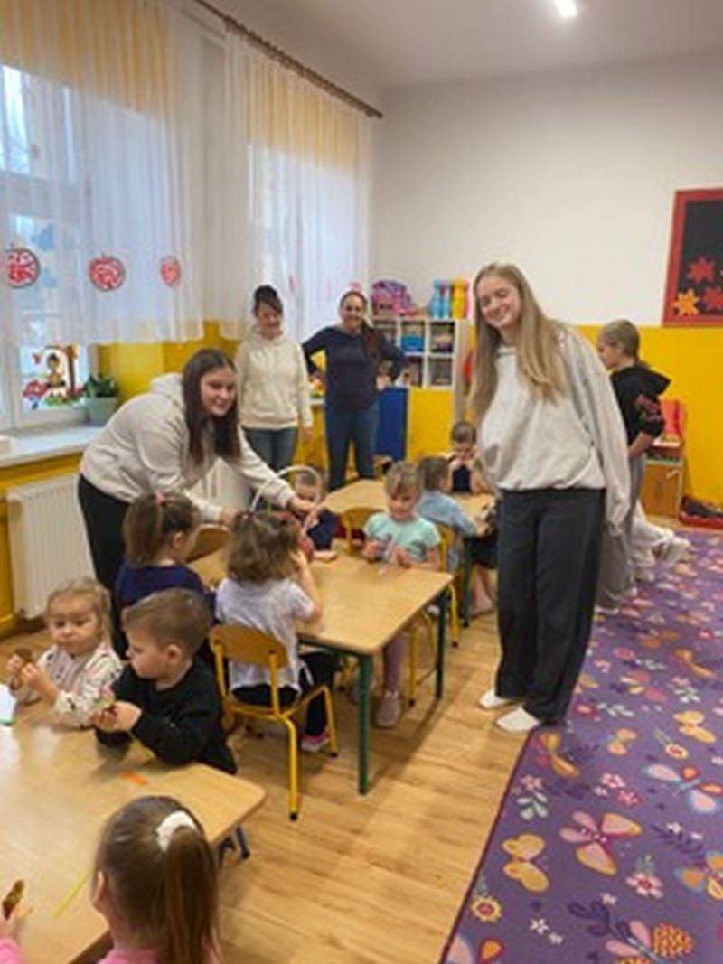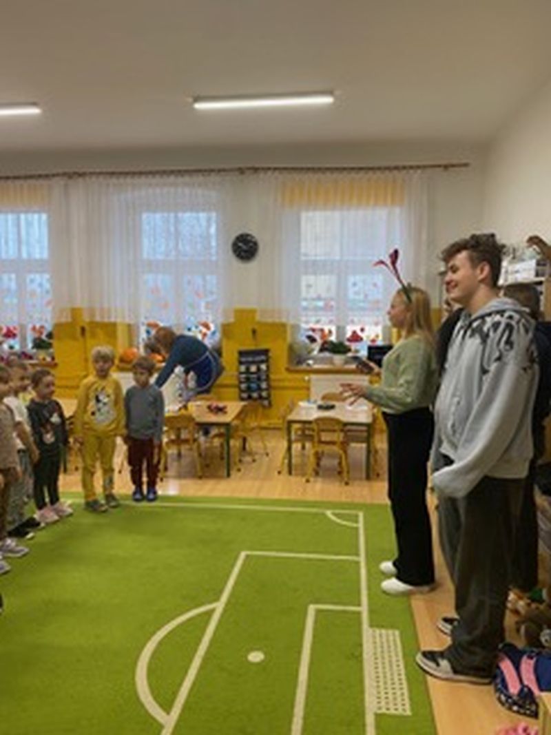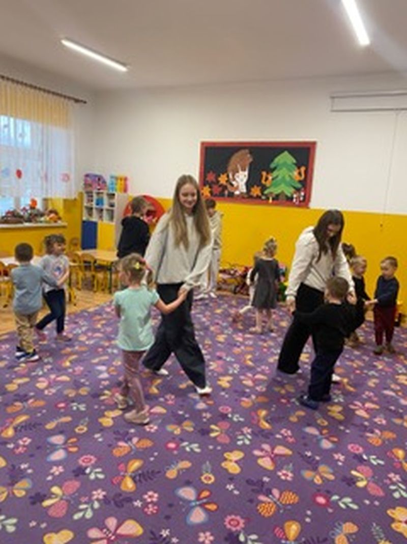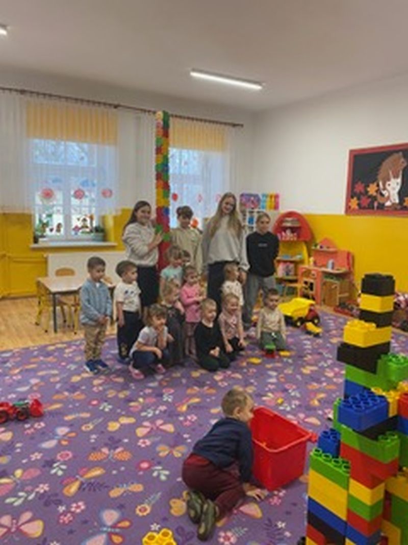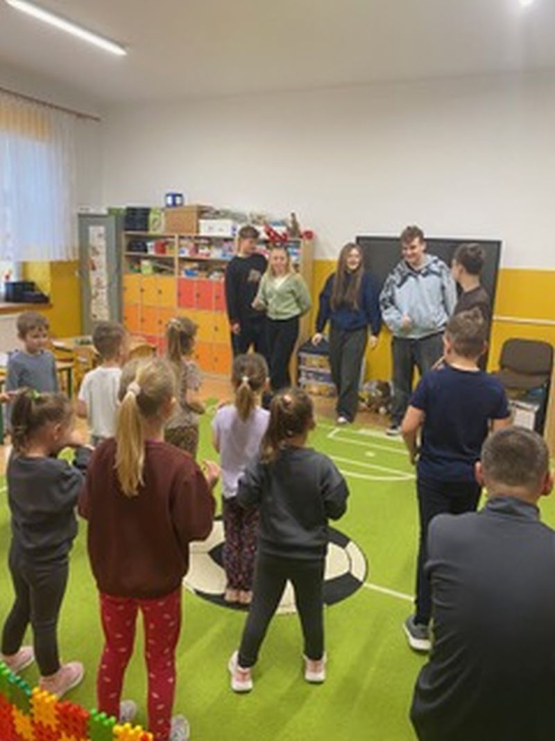Odwiedziny uczniów klasy VII w przedszkolu w grupach: Biedroneczki, Krasnoludki i Motylki.