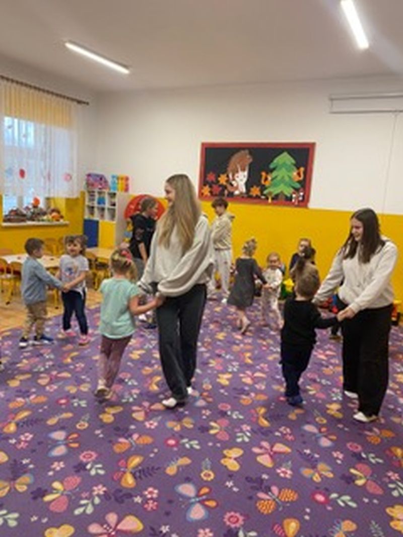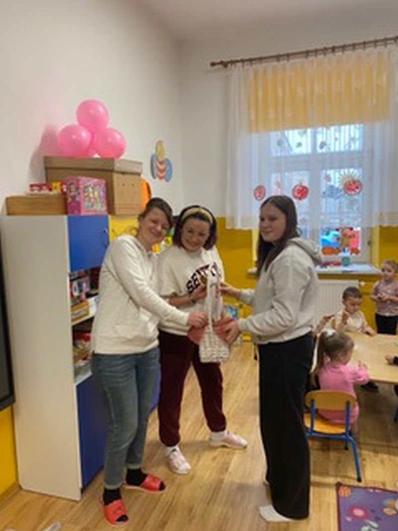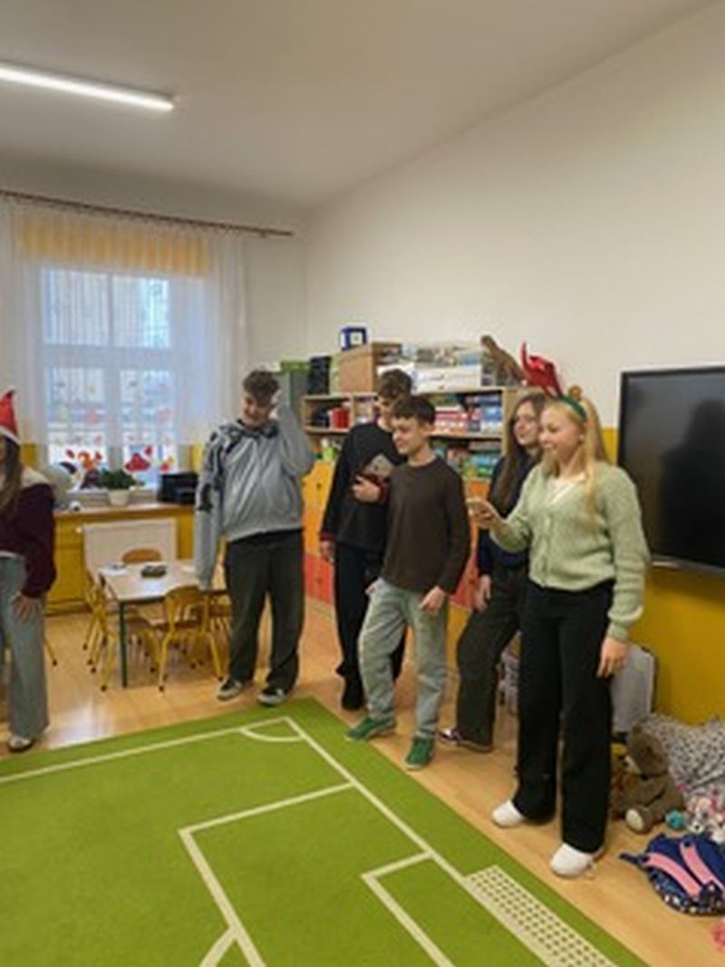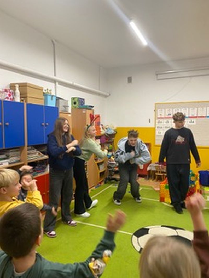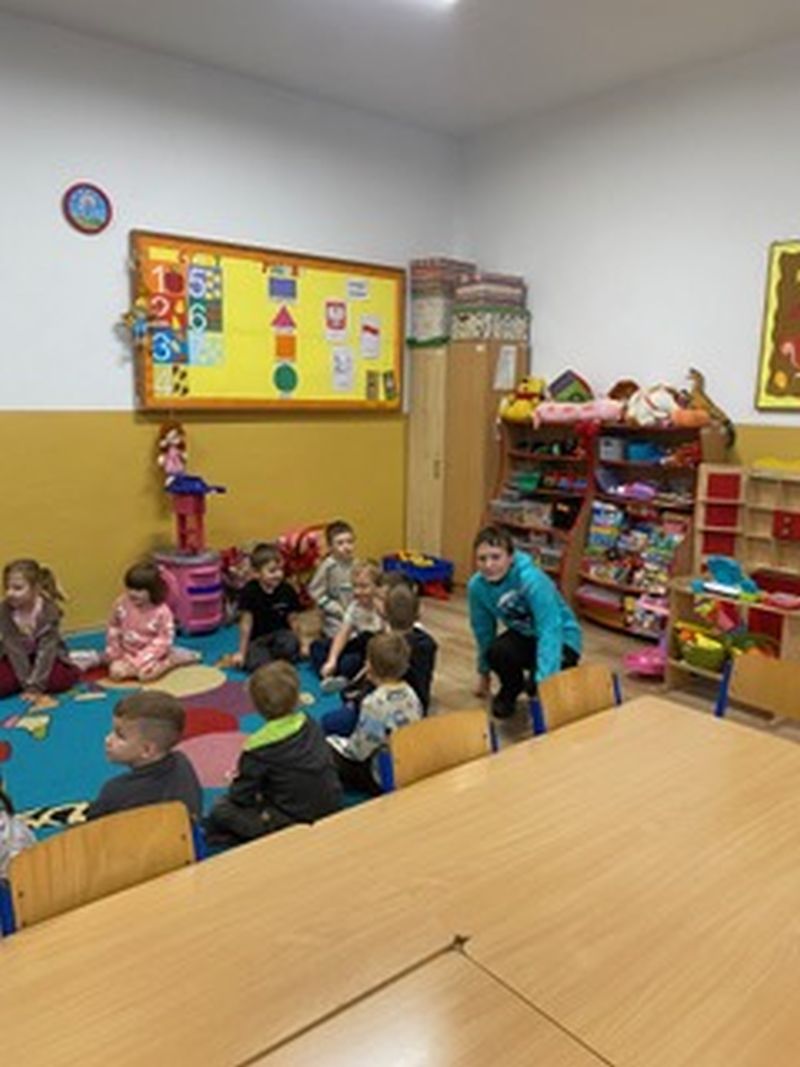 Odwiedziny uczniów klasy VII w przedszkolu w grupach: Biedroneczki, Krasnoludki i Motylki.